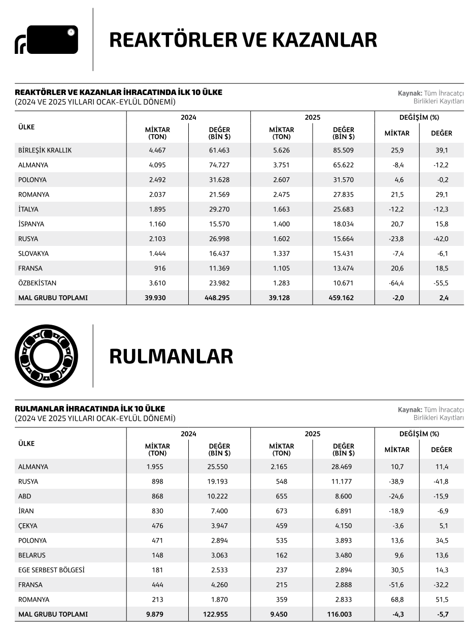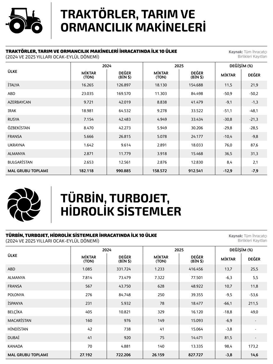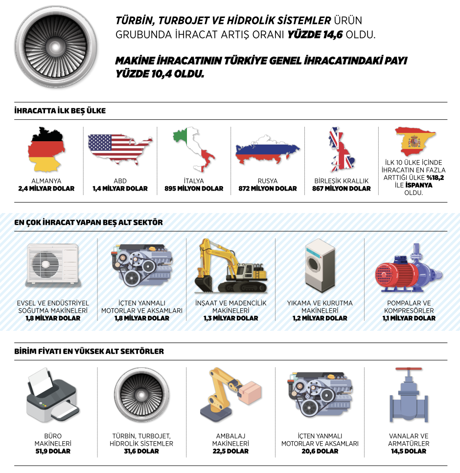 TÜRBİN, TURBOJET VE HİDROLİK SİSTEMLER ÜRÜN GRUBUNDA İHRACAT ARTIŞ ORANI YÜZDE 14,6 OLDU. MAKİNE İHRACATININ TÜRKİYE GENEL İHRACATINDAKİ PAYI YÜZDE 10,4 OLDU.