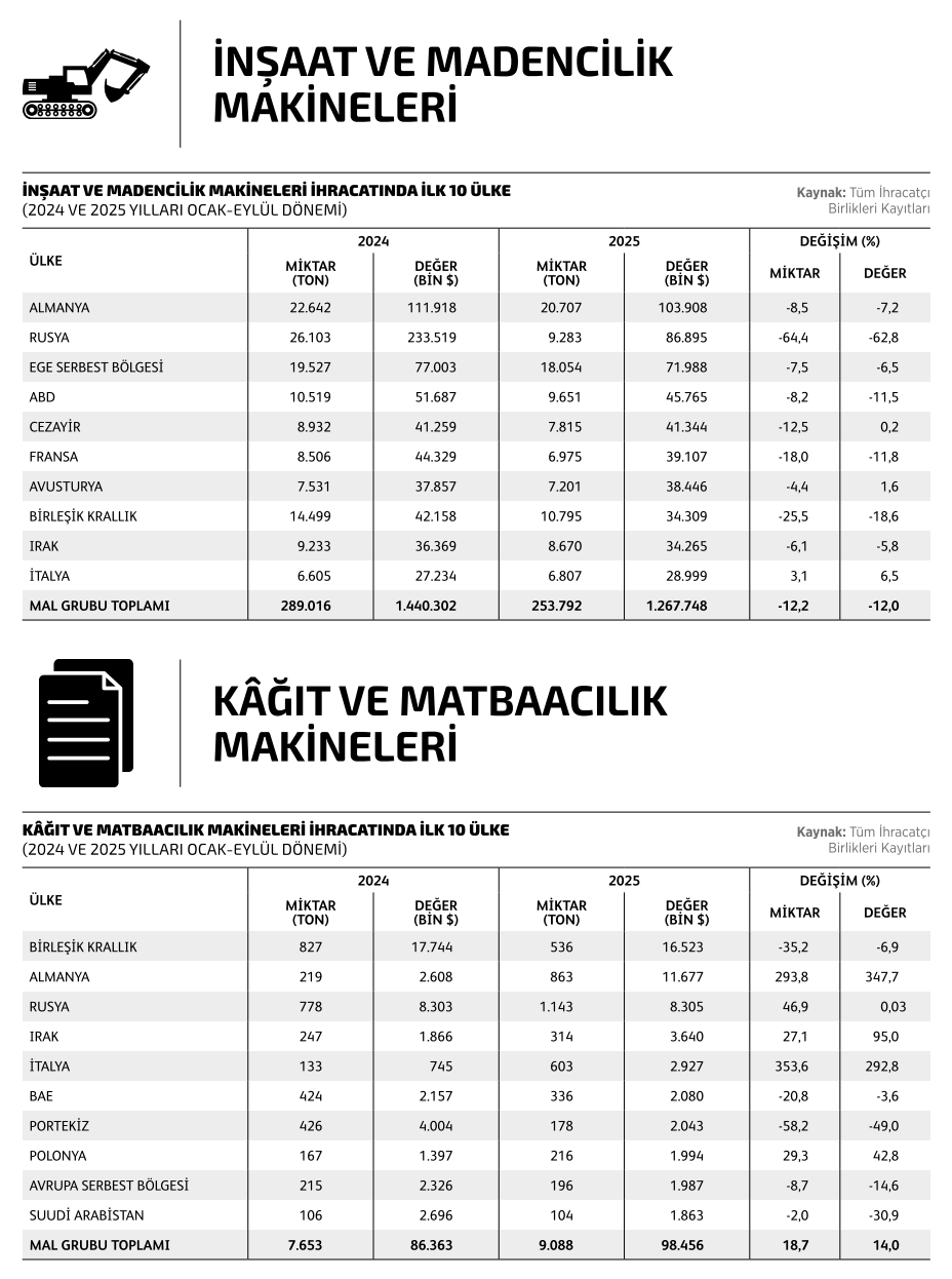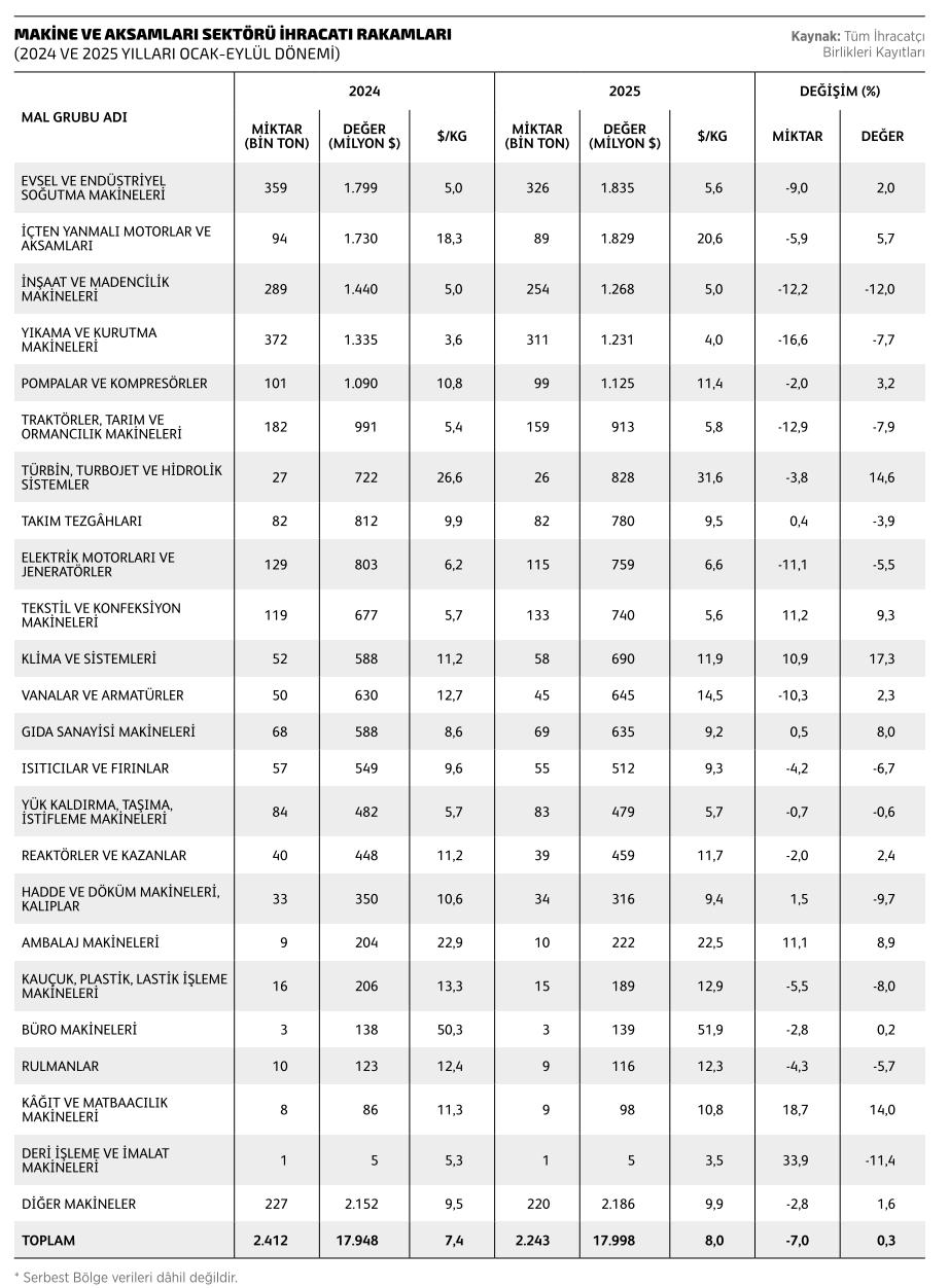 OCAK-EYLÜL DÖNEMİNDE MAKİNE İHRACATI SERBEST BÖLGELER DÂHİL 18,4 MİLYAR DOLAR OLDU